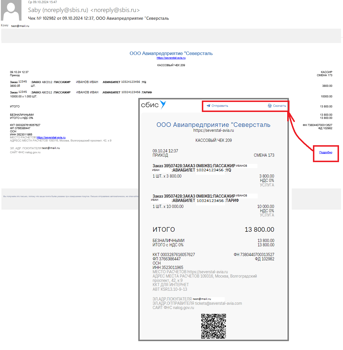 Электронный чек также будет направлен на электронную почту, указанную при бронировании, с электронного адреса noreply@sbis.ru. Чек формируется в течение суток с момента покупки билета. Чтобы сохранить его в формате pdf, нажмите «Подробнее», а затем «Скачать». QR код отобразится только после скачивания чека.