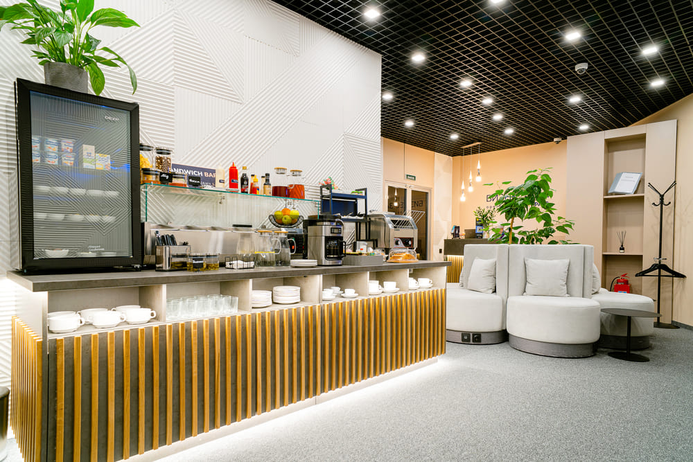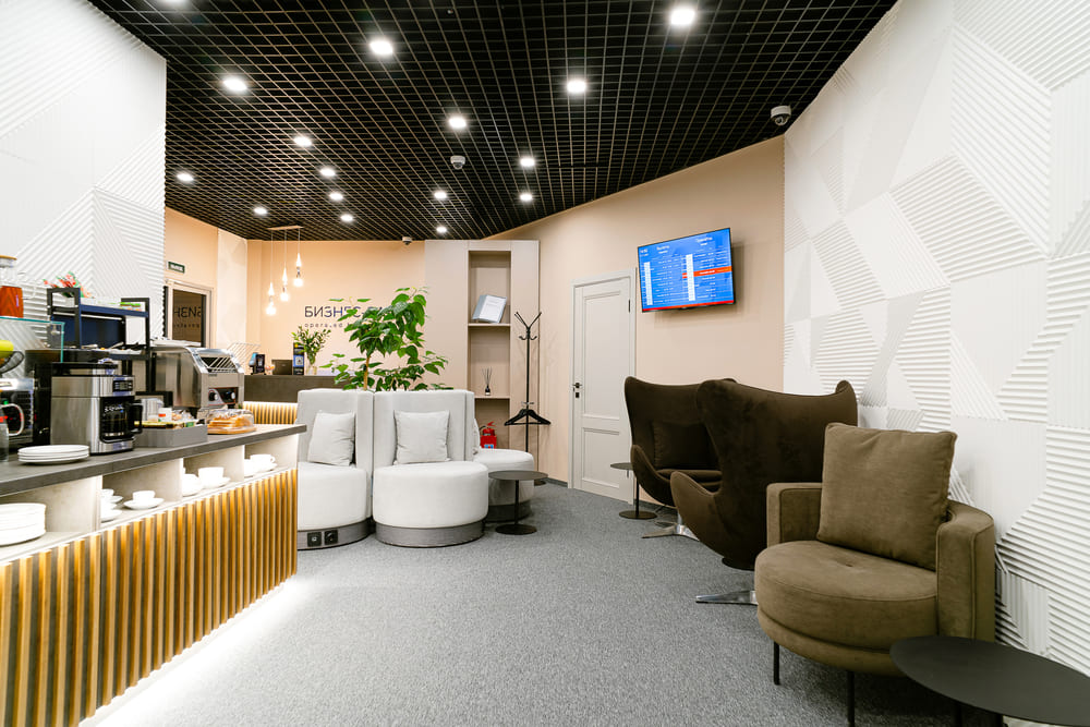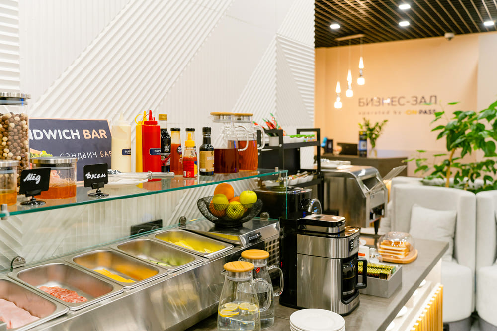 Уютная атмосфера, удобные посадочные места, легкие закуски и освежающие напитки обеспечат приятные впечатления перед полетом.